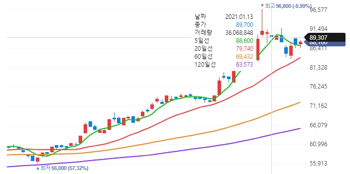 이 논리를 확장해 단기 이동평균선이 장기 이동평균선보다 위에 있냐 아래에 있냐를 보면 최근 주가가 상승 중인지 하락 중인지를 한눈에 파악할 수 있다. 위 차트에서 5일선>20일선>60일선>120일선이 순서대로 위치하고 있으므로 최근 120일간 주가는 상승하고 있었다는 것을 알 수 있다.